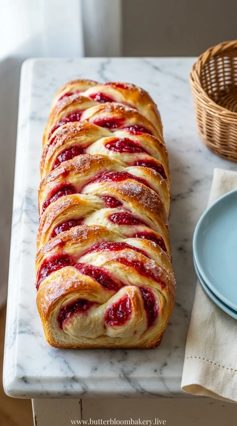 A soft, buttery brioche loaf swirled with sweet raspberry ribbons, perfect for a leisurely breakfast or a gentle dessert treat that feels like a quiet hug on a plate.