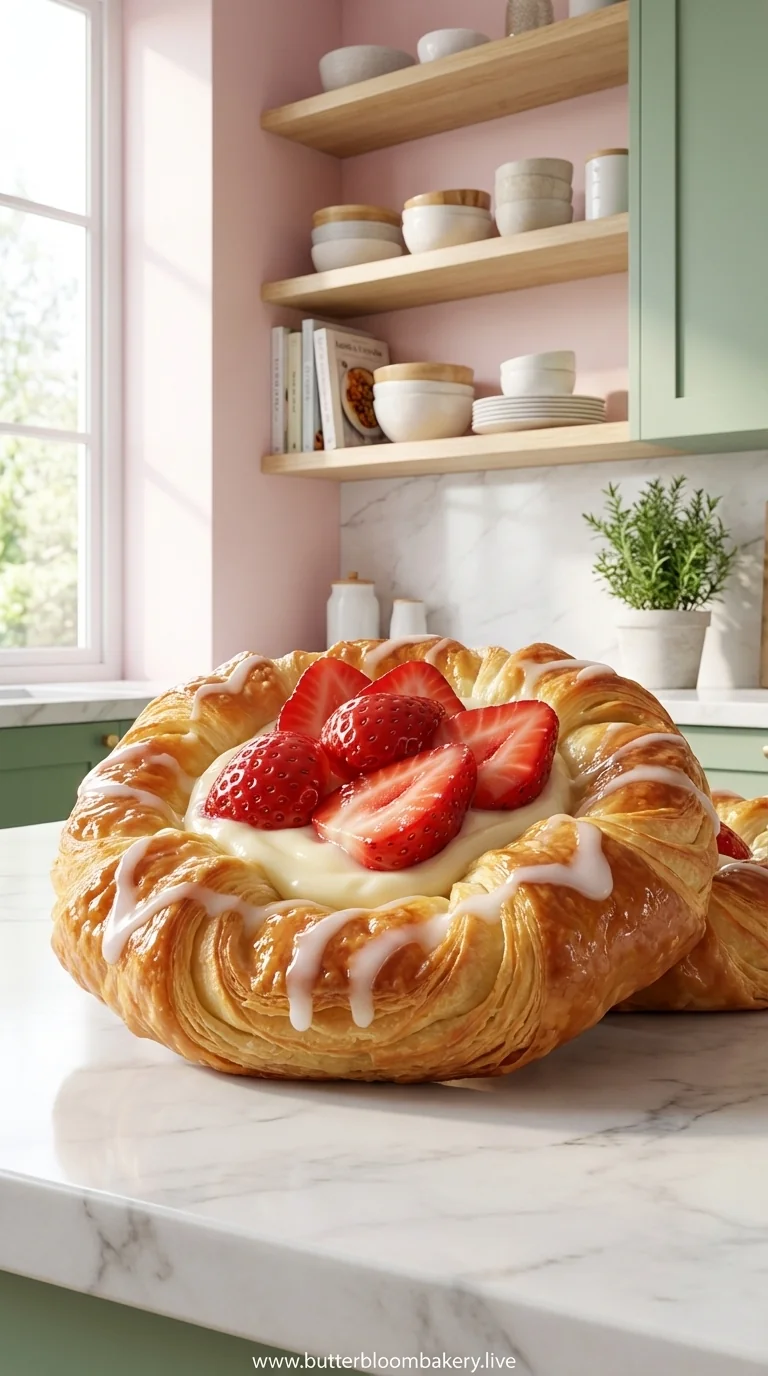 A buttery, flaky strawberry Danish that melts in your mouth, filled with luscious cream cheese and sweet berries. Explore more pastries collection for more delights.